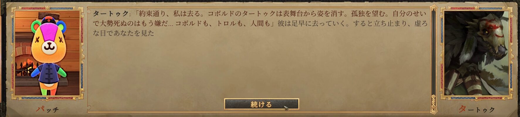 タートゥチオは、前周でのプレイ時はシカモアの時と同じように、コボルドに変装してるだけだと思っていたのですが、本当にコボルドになってるんですね。可哀そうに。