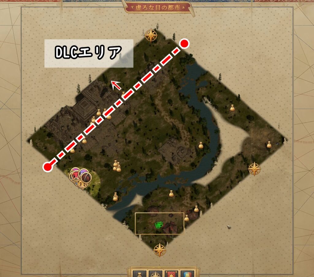 変に作り込んであって、ここは赤い点線の上側がDLCで訪れる時のエリアになっています。(同じ名前のマップだけど、違うように見える。)