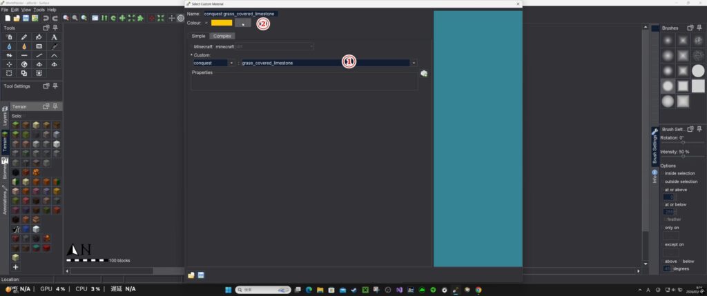 ②はWorld Painterで表示される色の設定。自分がわかりやすい物に設定する。