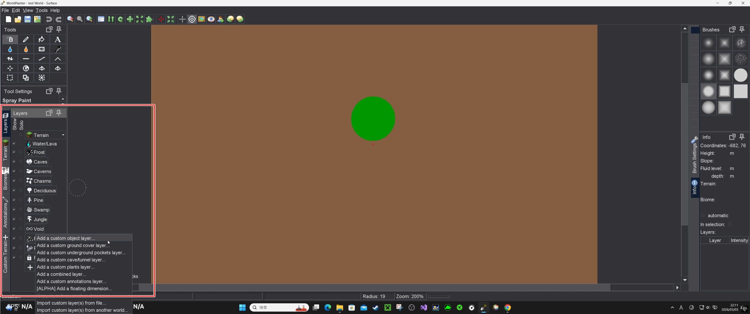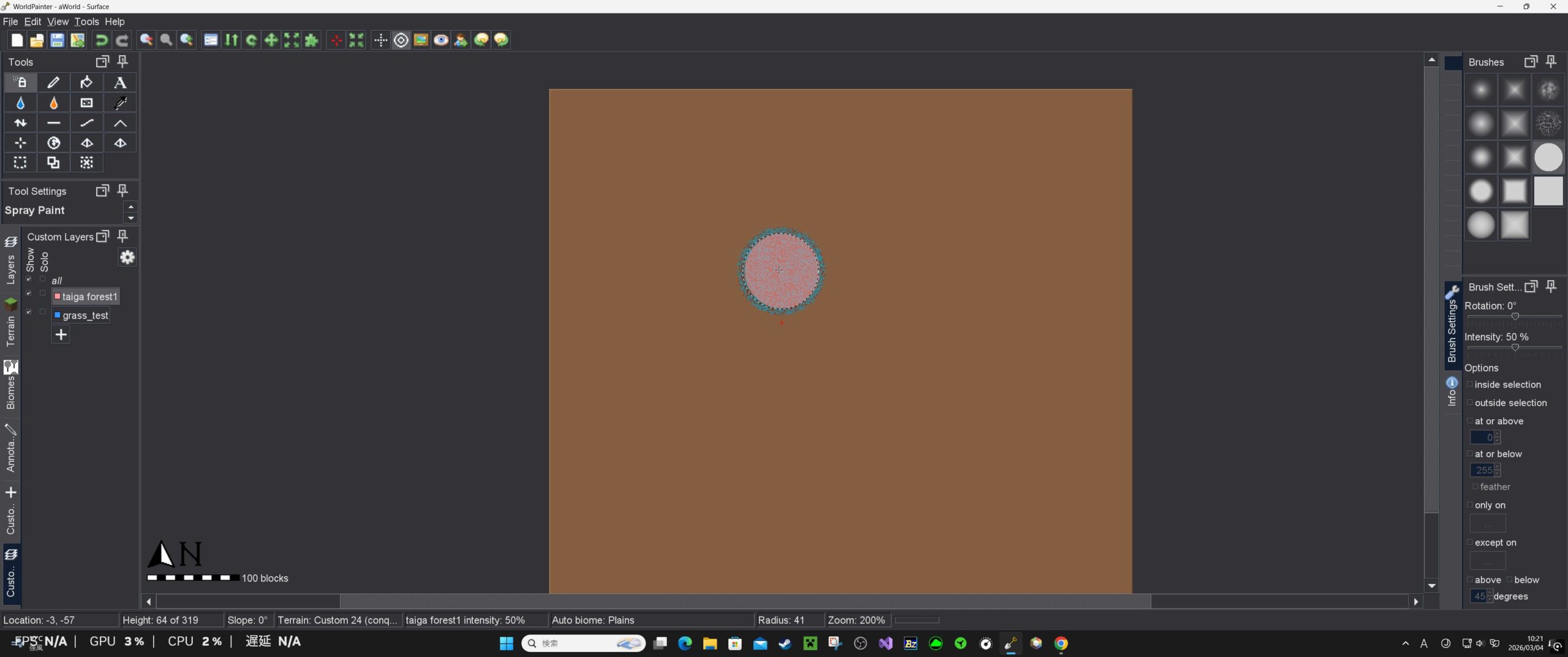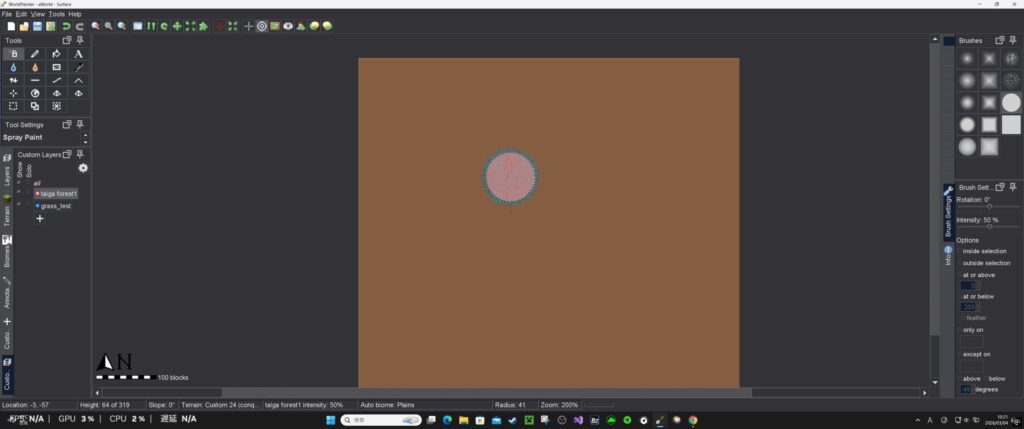 World Painter上で、適用したい場所にToolのスプレーで噴射する。(Custom Terrainで作った地形の上に生成してみます)