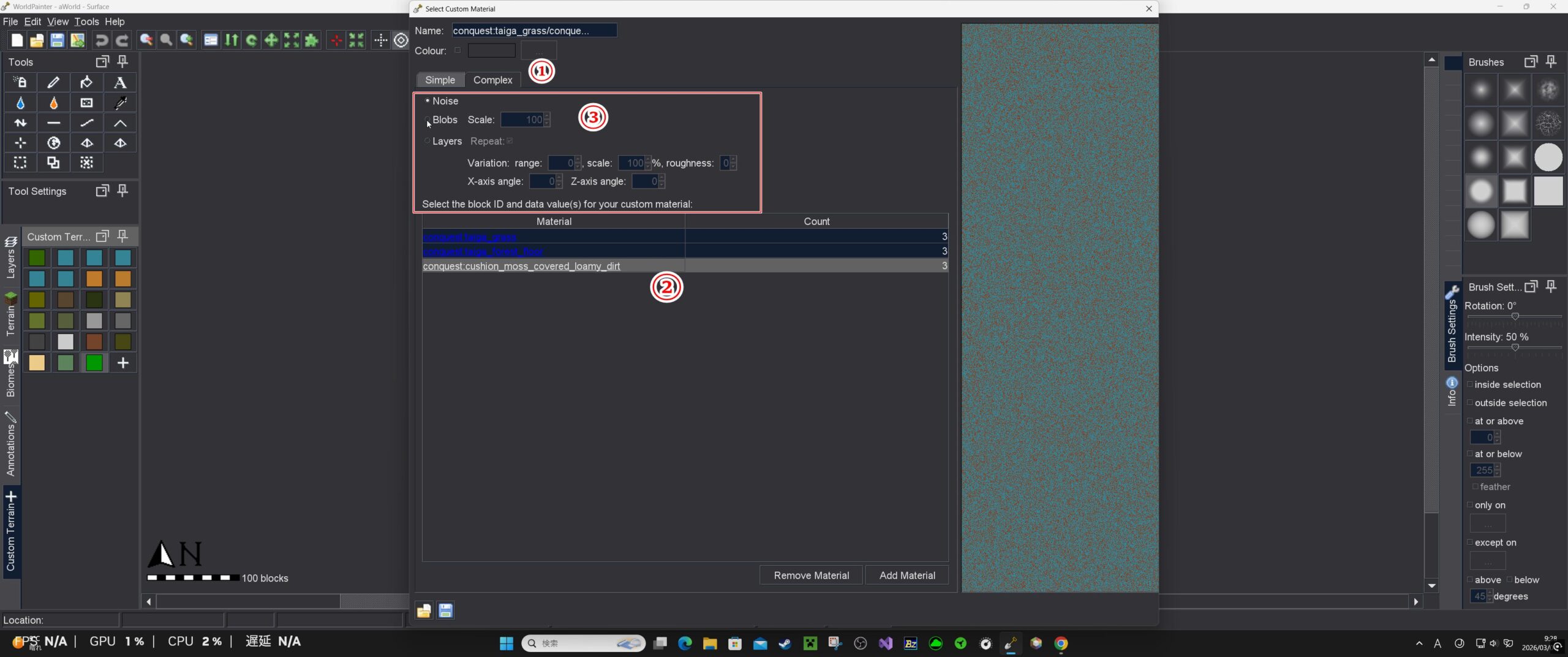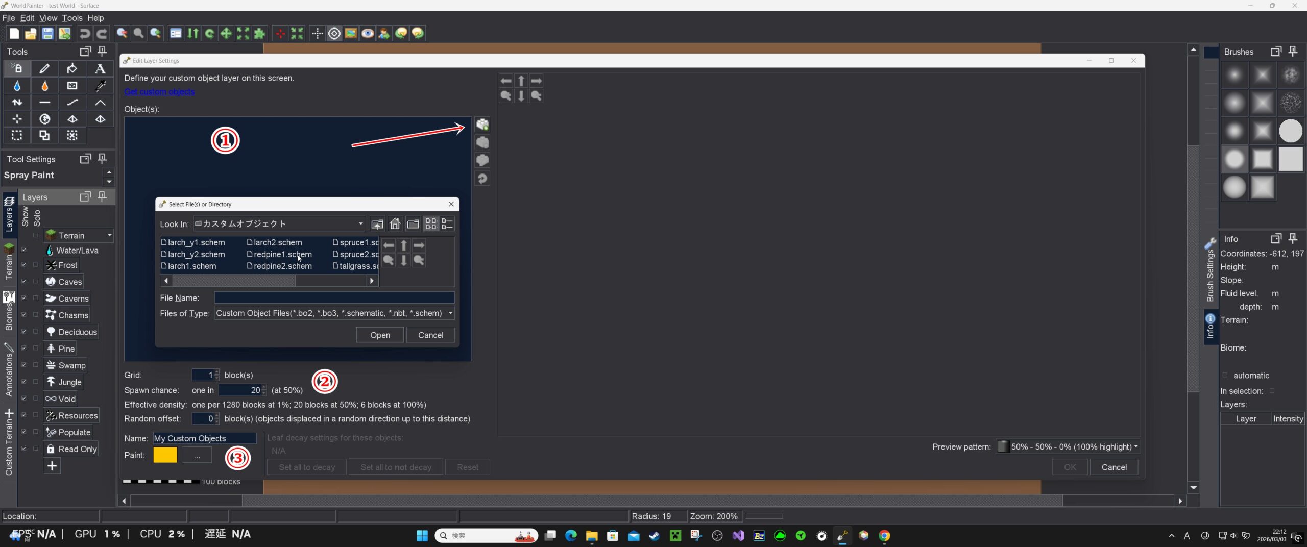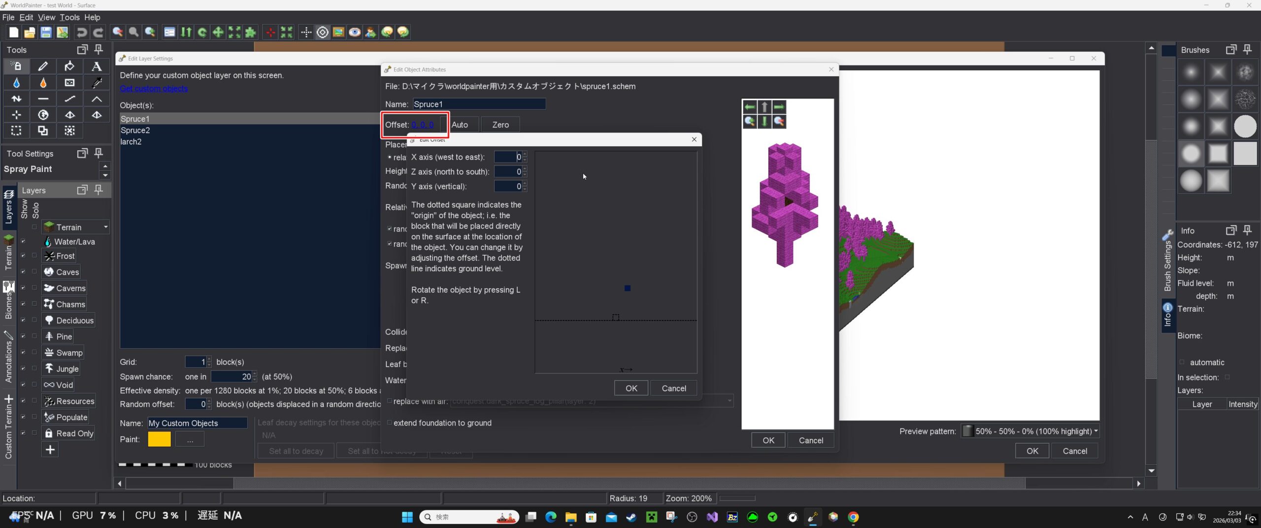 World Painter上で、適用したい場所にToolのスプレーで噴射する。(Custom Terrainで作った地形の上に生成してみます)