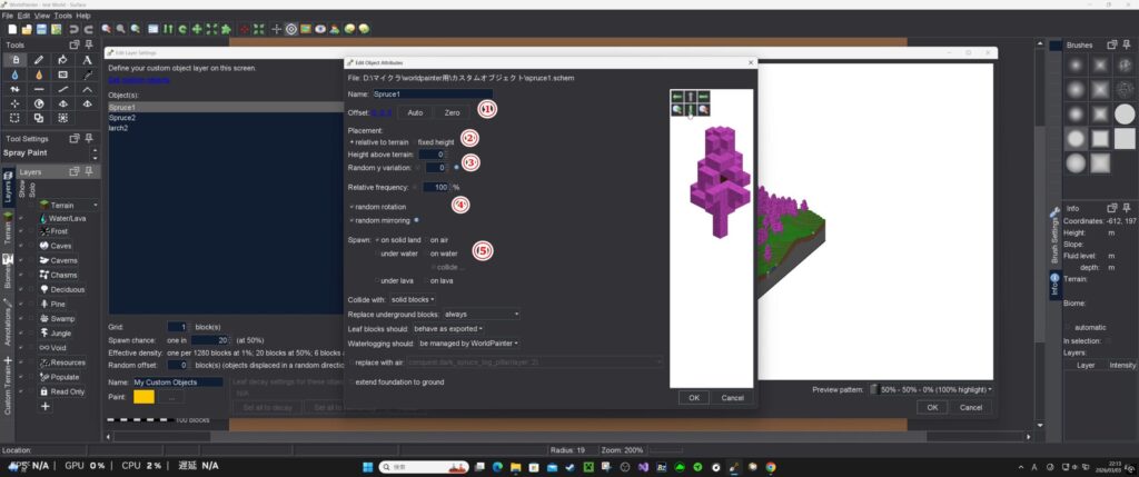 追加したいオブジェクトを選ぶと、選択した数だけ①の場所に並ぶ(今回は3本の木:右のプレビューウィンドウがピンクなのはMODのブロックを使ったものを追加しているから。Minecraftのブロックを使った物なら、色も反映される)。
